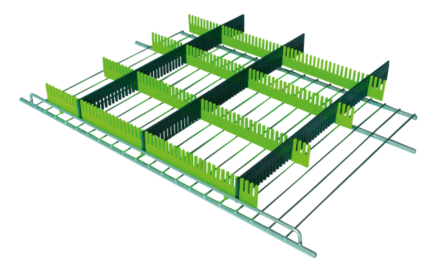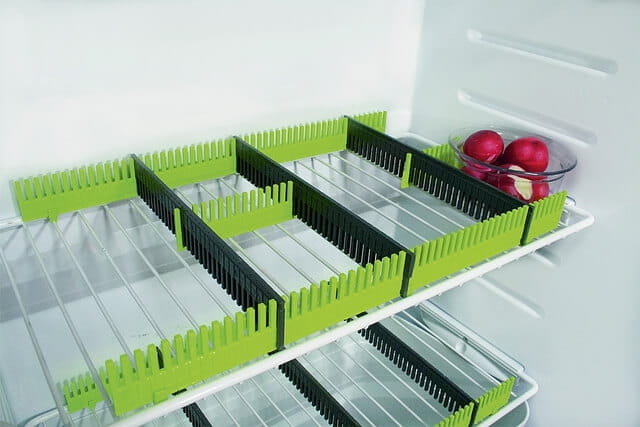 Systemowy organizer do lodówki składający się z 8 listewek, które można przycinać i ustawiać w dowolnej konfiguracji. Dzięki temu możemy dopasować wielkość przegródek do produktów.