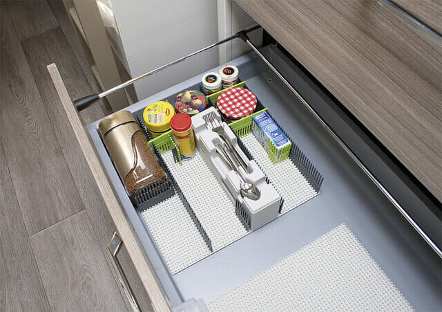 Dzięki specjalnej budowie płytę można przycinać tak, aby dopasować ją do każdej szuflady czy szafki. Dodatkowo, za pomocą listewek tworzymy przegródki dowolnej wielkości tak, aby dopasować je do wielkości i kształtów przedmiotów.