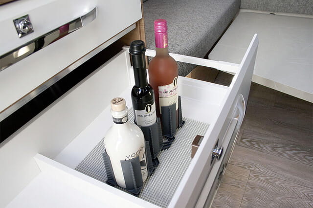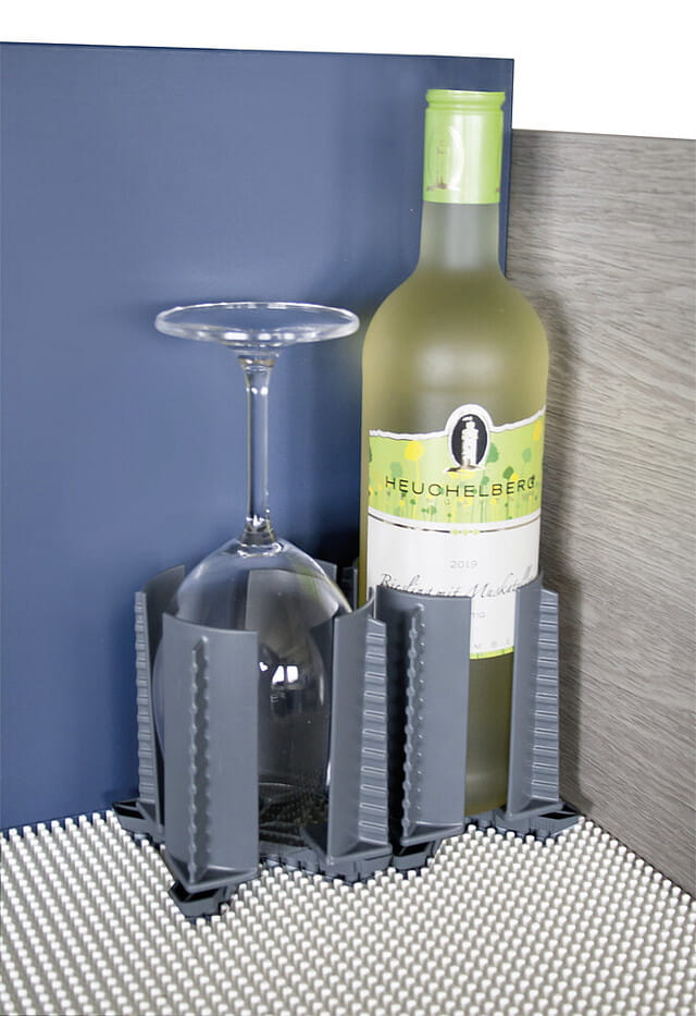 Uchwyt świetnie sprawdzi się w kamperze i przyczepie kempingowej – zabezpieczy butelki i szklanki w trakcie jazdy. Wraz z podkładką, organizer można dopasować do każdej szuflady czy szafki.